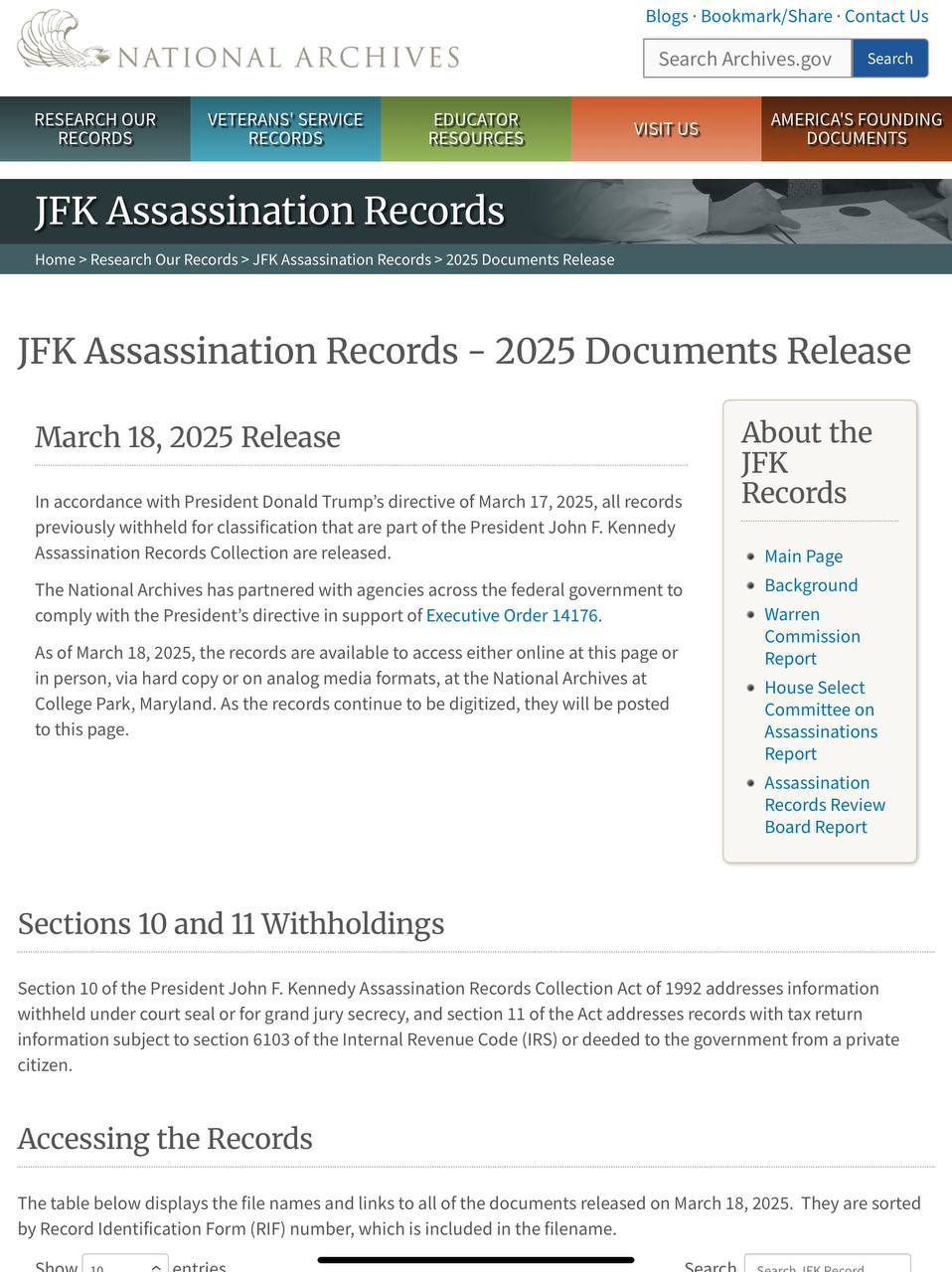 Директор національної розвідки Трампа Тулсі Габбард у дописі в соцмережі X поділилася посиланням на сторінку на сайті Національного управління архівів і документації (NARA), де розміщені записи.