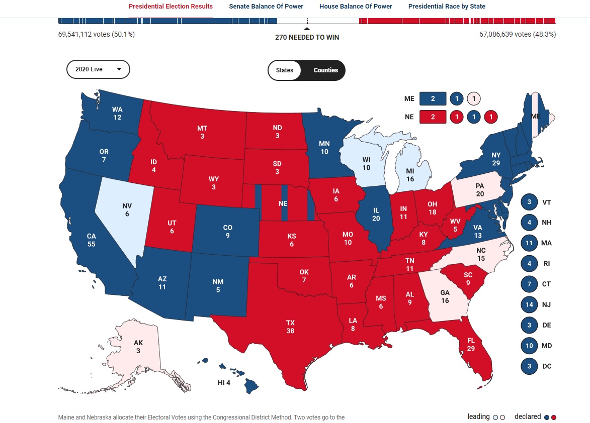 На даний момент за результатами підрахунку за чинного главу США Дональда Трампа свої голоси віддали 48,4% американців. Він отримав 213 голосів вибірників. Джо Байдена підтримали 50% американців. Наразі він набирає 238 голосів вибірників.