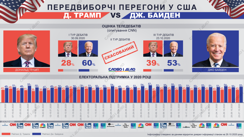 Кандидат від Демократичної партії США має більше 50% схвалення з боку населення за ключовими показниками. В 2016 році за шість днів до виборів Хілларі Клінтон випереджала Трампа на 3,1%, тоді як Байден в даний час - на 8,7%.