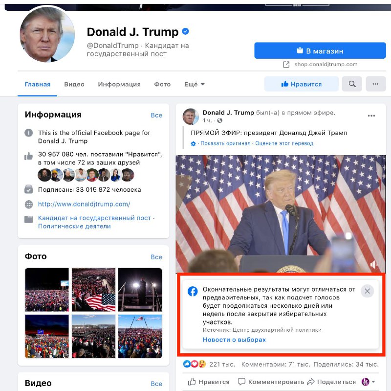 Але також не сподобався пост Трампа і адміністрації Facebook. Його замітку приховувати не стали, але написали: "Остаточні результати можуть відрізнятися від попередніх, так як підрахунок голосів триватиме кілька днів або тижнів після закриття виборчих дільниць".