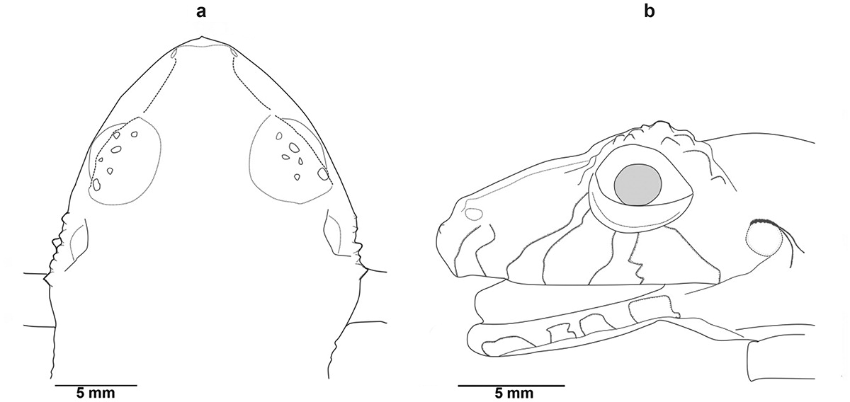 Жаба з червоними очима і жовтою, коричневою, чорною та оранжевою шкірою може сягати 2,4 сантиметра в зрілому віці у самців і 3,6 сантиметра у самок.