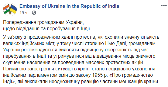 Варто відзначити, що посольство України в Індії відреагувало на протести, порадивши українцям проявляти підвищену обережність під час перебування в країні. Також туристів закликали утримуватися від відвідування акцій і місць великого скупчення людей.