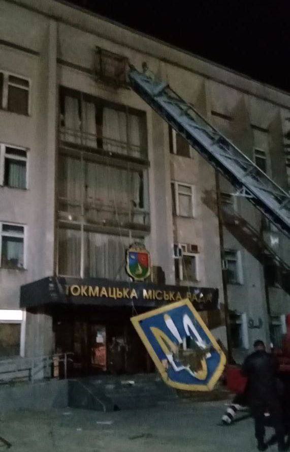 15:43 Окупований Токмак Запорізької області. З будівлі міськради вороги зняли герб України.