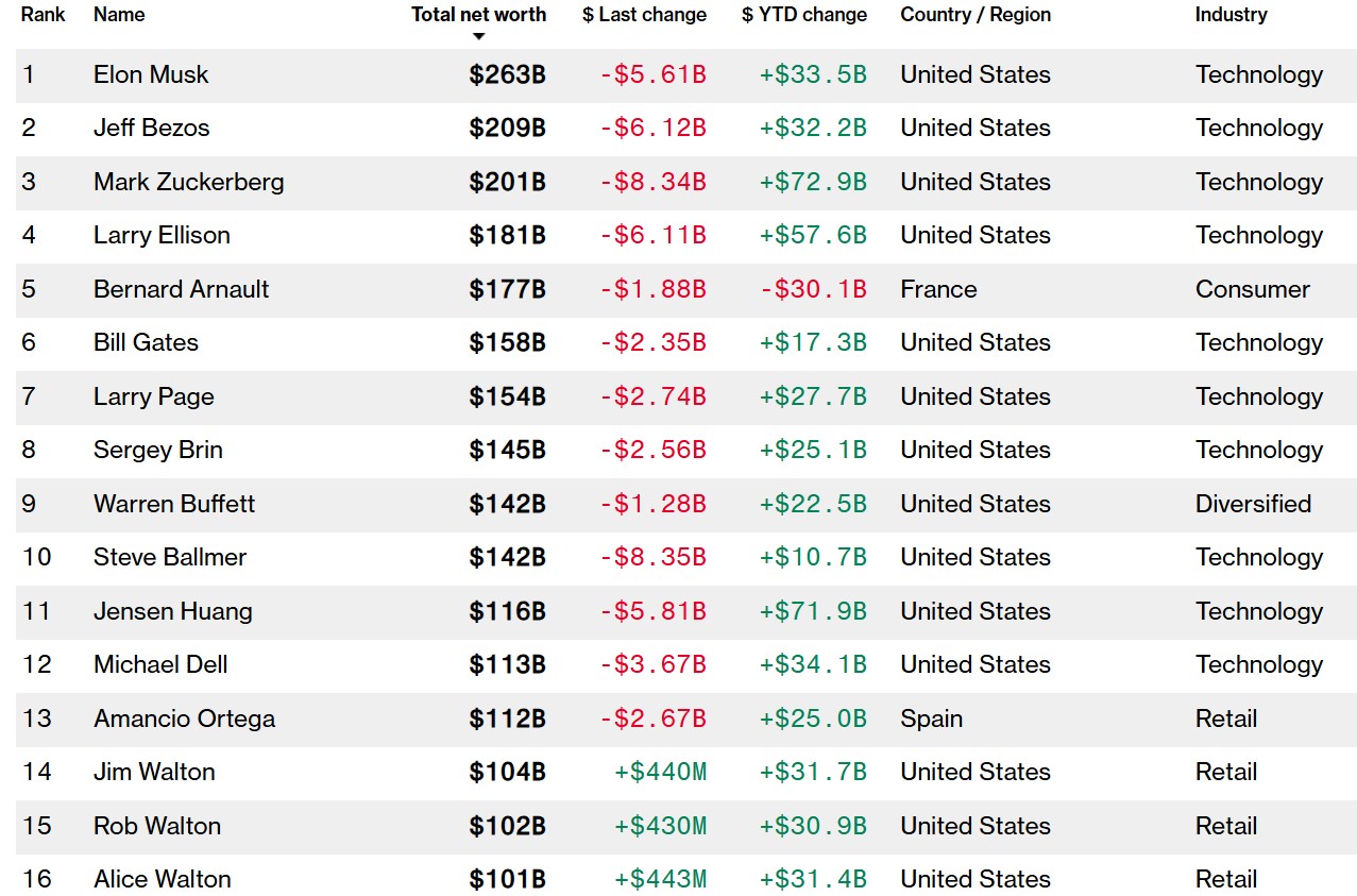 Бізнесмен Ілон Маск, який заснував Tesla та SpaceX, а також є власником мережі Х, очолив список найбагатших людей планети.