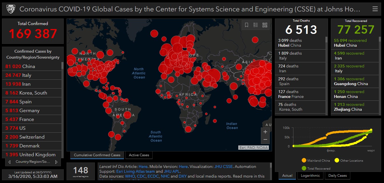 Про це можна судити по карті поширення коронавірусу від Центру системних досліджень і інжинірингу при Університеті Джона Хопкінса.