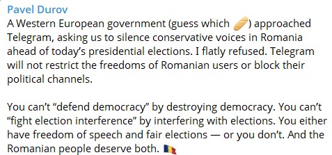"Західноєвропейський уряд (вгадайте який) звернувся до Telegram з проханням заглушити консервативні голоси в Румунії напередодні сьогоднішніх президентських виборів. Я категорично відмовився. Telegram не обмежуватиме свободи румунських користувачів і не блокуватиме їхні політичні канали", - зазначив Дуров.