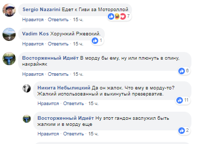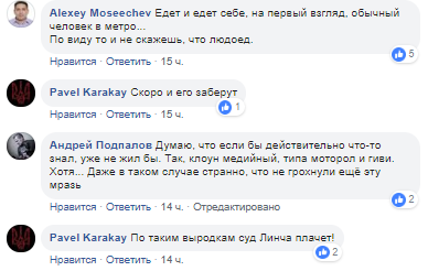 "Їде до Гіві та Моторолли", "Хорунжий Ржевський", "В морду б йому, ну або плюнути в спину, накрайняк", "Так він жалюгідний. Що йому в морду? Жалюгідний використаний і викинутий презерватив", "Ну цей га*дон заслужив бути жалюгідним і в морду ще", "їде і їде собі, на перший погляд, звичайна людина в метро... По виду то й не скажеш, що людожер", "Скоро і його заберуть", "Думаю, що якщо б дійсно щось знав, вже не жив би. Так, клоун медійний, типу Мотороли і Гіві. Хоча... Навіть в такому випадку дивно, що не гримнули ще цю мерзоту", - пишуть коментатори.