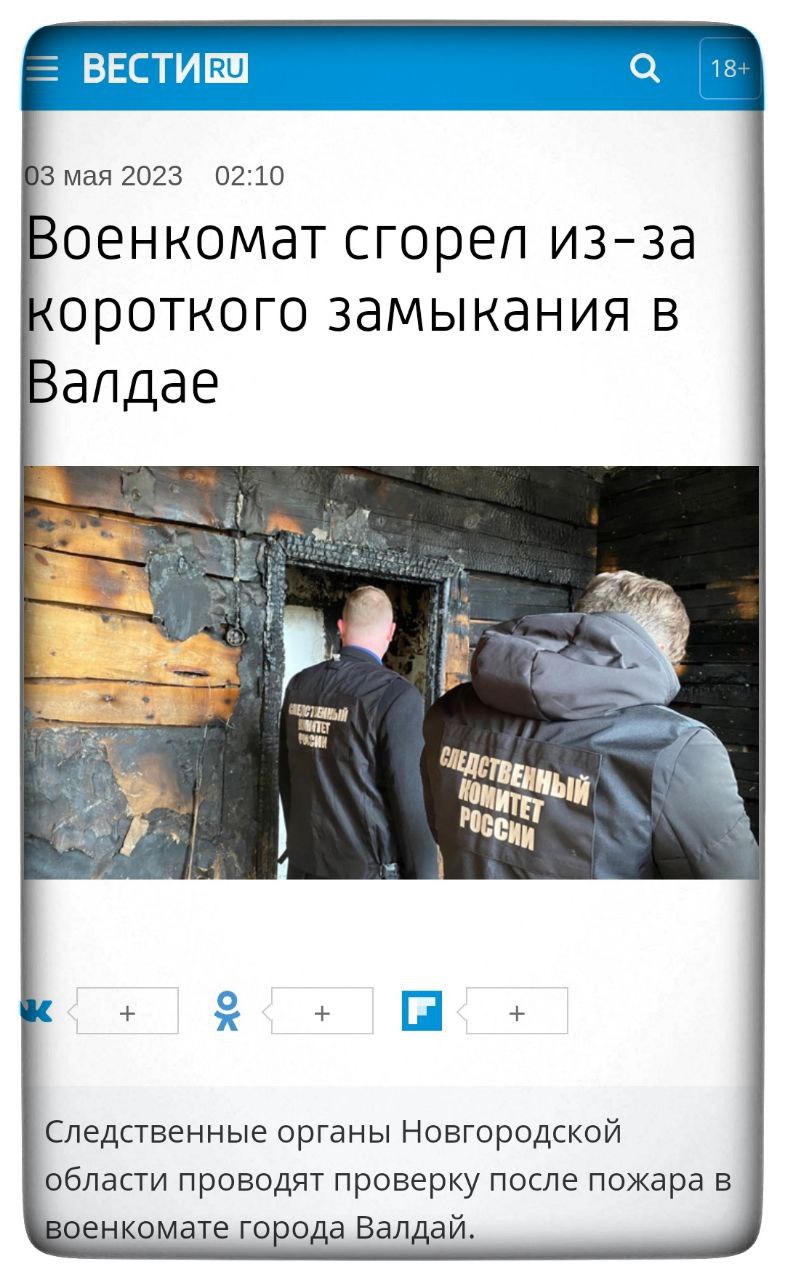 Про пожежу, що спалахнула в Новгородській області, у місті Валдай, повідомив слідчий комітет із Новгородської області. Вона почалася у дерев'яній прибудові, потім перекинулася на дах військкомату. У ЗМІ країни-агресора повідомили про те, що через пожежу постраждала не лише будівля, а й магістральний кабель оптичної лінії зв'язку.