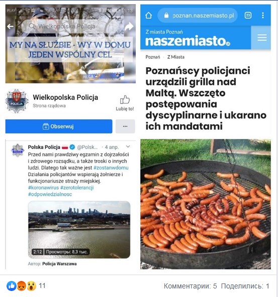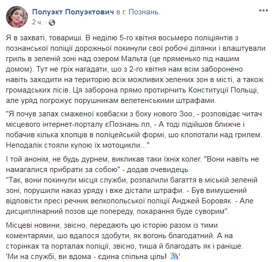 "У неділю, 5 квітня вісім поліцейських з познанської поліції покинули свої робочі ділянки і влаштували гриль в зеленій зоні над озером Мальта (це прямісінько під нашим будинком). Тут не гріх нагадати, що з 2-го квітня нам усім заборонено навіть заходити на територію всіх можливих зелених зон в місті, а також громадських лісів. Ця заборона прямо суперечить Конституції Польщі, але уряд загрожує порушникам величезними штрафами", - написала автор.