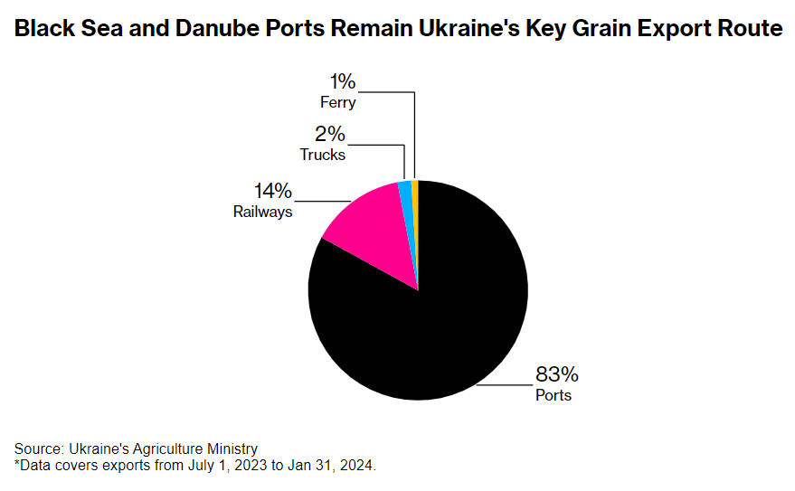 Портовий експорт з України займає переважну більшість у доставці зерна – 83% експорту зерна припадає на морські та річкові коридори. Попри те, що на залізницю та вантажні перевезення припадає всього 16% експорту збіжжя, через блокування кордону поляками експорт впав з 1,3 млн тонн у 2022 році до 300 тис. тонн зерна у 2024 році.