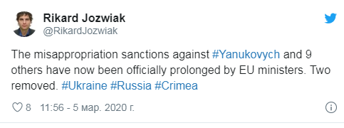 "Санкції проти Януковича і ще 9 осіб були офіційно продовжені міністрами ЄС. Двоє людей зі списку видалені", - написав журналіст.