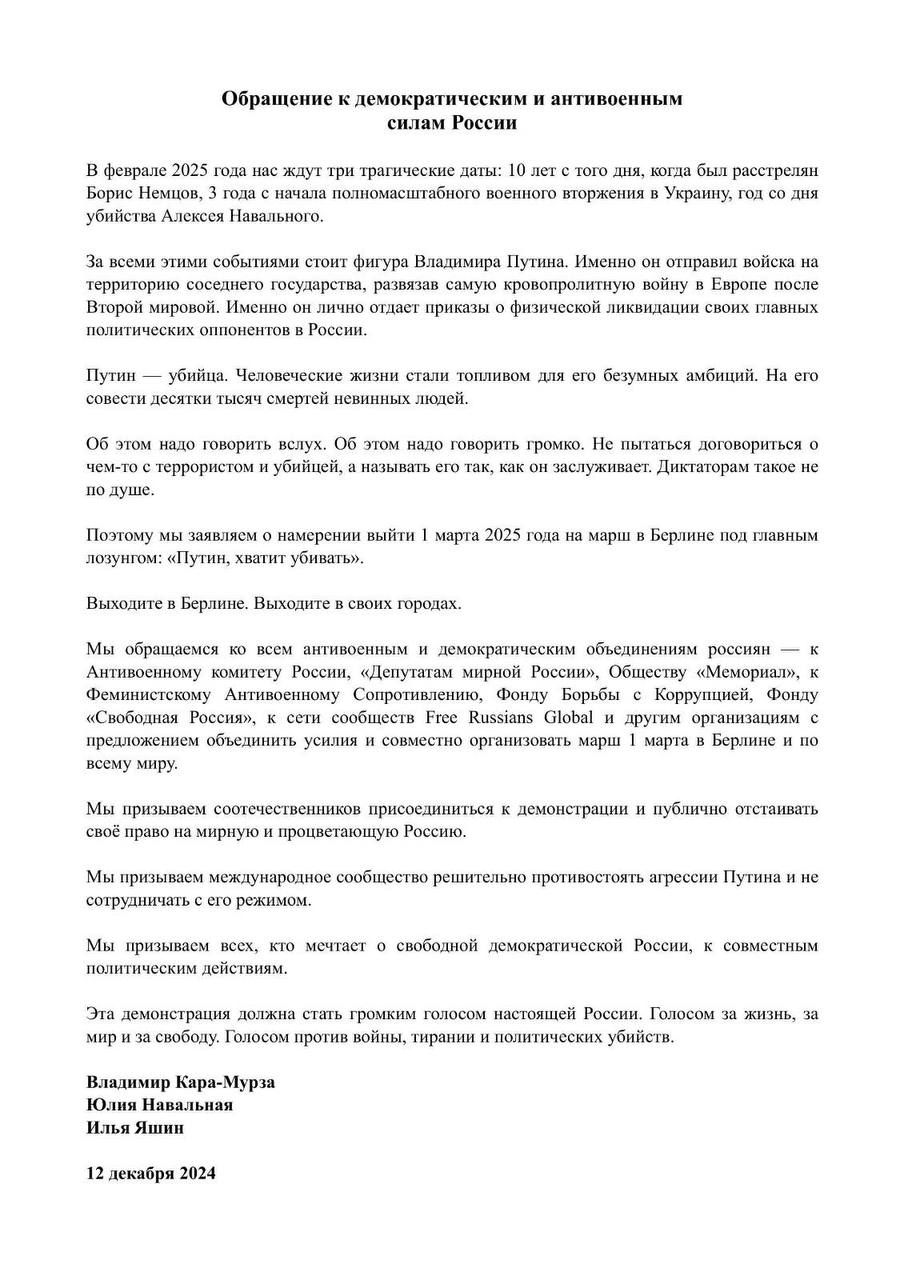 Російські опозиціонери Юлія Навальна, Ілля Яшин та Володимир Кара-Мурза анонсували ще один антивоєнний мітинг у Берліні. Він пройде 1 березня 2025 року.