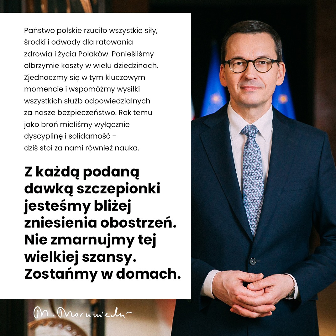"Польська держава кинула всі сили і ресурси, щоб врятувати здоров'я і життя поляків. Ми понесли величезні витрати в багатьох сферах. Давайте об'єднаємося в цей вирішальний момент і підтримаємо зусилля всіх служб, відповідальних за нашу безпеку", - закликав він співгромадян.