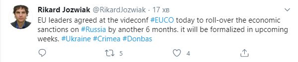 "Лідери ЄС домовилися сьогодні на відеоконференції EUCO про продовження економічних санкцій щодо Росії ще на 6 місяців. Це буде оформлено в найближчі тижні", – написав Йозвяк.