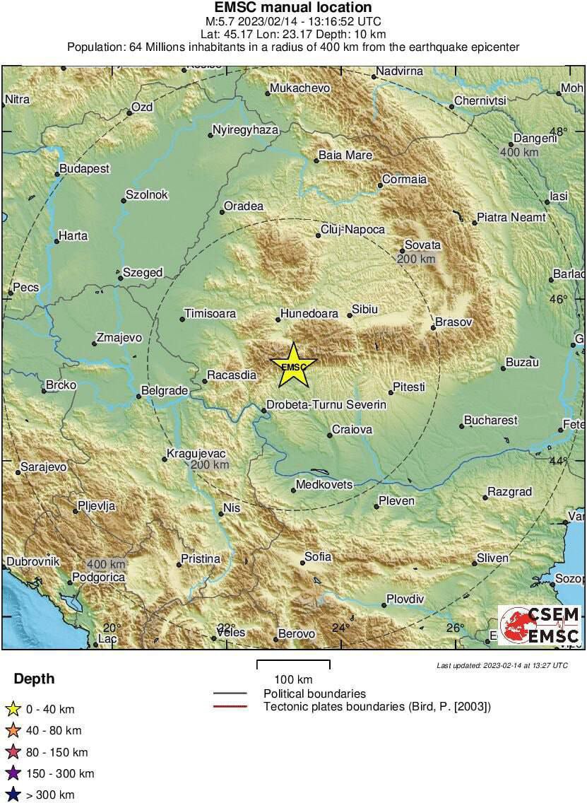 Після потужного землетрусу магнітудою 7,8, який стався в Туреччині 6 лютого, кількість загиблих зросла до 31 974 осіб, а сьогодні, 14 лютого, в Румунії о 15:16 за місцевим часом був зареєстрований повторний землетрус магнітудою 5,7, після того, як у понеділок там стався землетрус магнітудою 5,2.