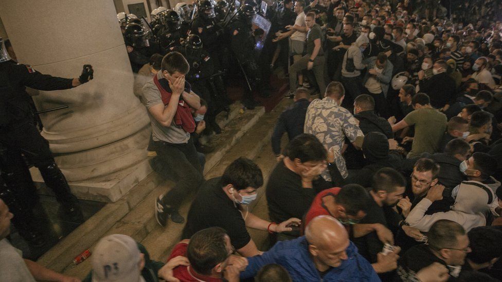 Вучич пов'язав протести і сутички з поліцією з майбутніми переговорами щодо Косова в Брюсселі. Він також виправдав дії поліції, заявивши, що вона відповіла тільки після того, коли "праворадикали і екстремісти" захопили хол парламенту, використовуючи ножі, каміння і коктейлі Молотова.