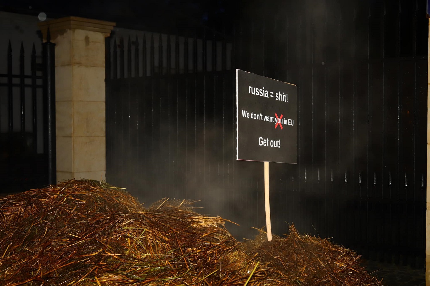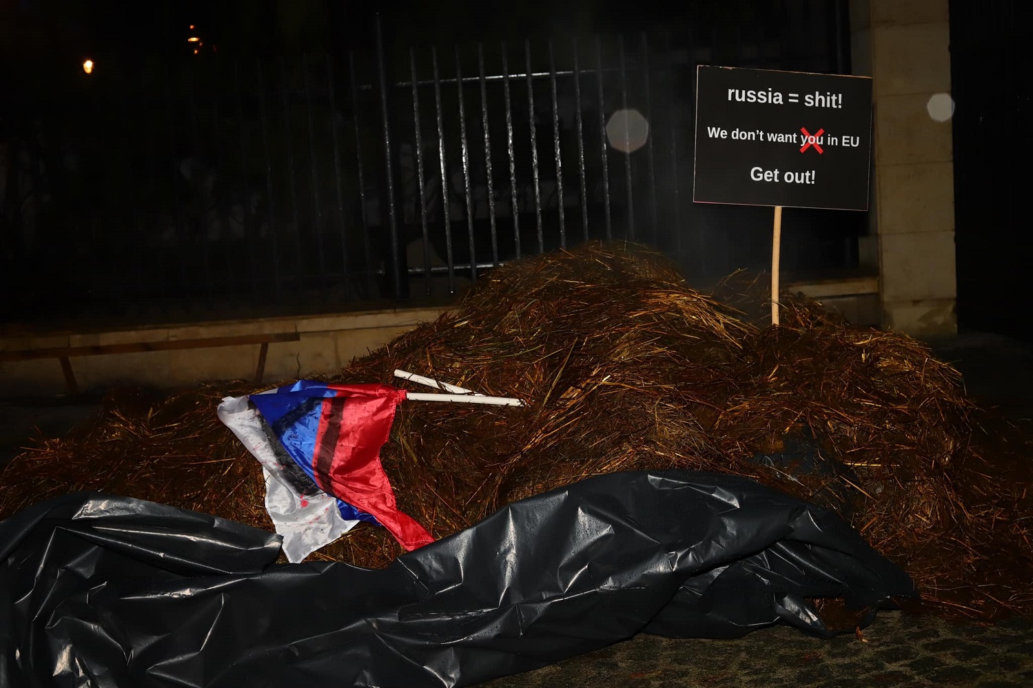"Так, ви все добре бачите. Це ворота вілли в якій проживає посол країни-агресора в Польщі, закривавлений прапор країни-терориста з літерою Z, 2 тонни лайна і напис від поляків. "Росія = лайно! Ми не хочемо вас бачити в Європі! Забирайтеся геть!", - пишуть у соцмережі.