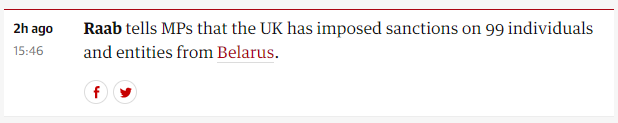 Міністр закордонних справ Великої Британії Домінік Рааб заявив, що офіційний Лондон ввів санкції проти 99 білоруських чиновників і компаній.