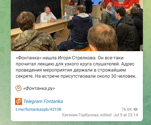 "Поліція прийшла до книжної лавки "Листва" в Петербурзі, де планувалася лекція Гіркіна. Спершу організатори лекції отримали попередження від поліції. Напередодні лекції до лавки приїхали співробітники "служби боротьби з тероризмом" та росгвардії під приводом повідомлень про "мінування" лавки. Під час т.зв. "розмінування" в лавці провели обшук. Гіркін переніс лекцію до іншого місця, адреса якого не розголошувалась", - йдеться в повідомленні.