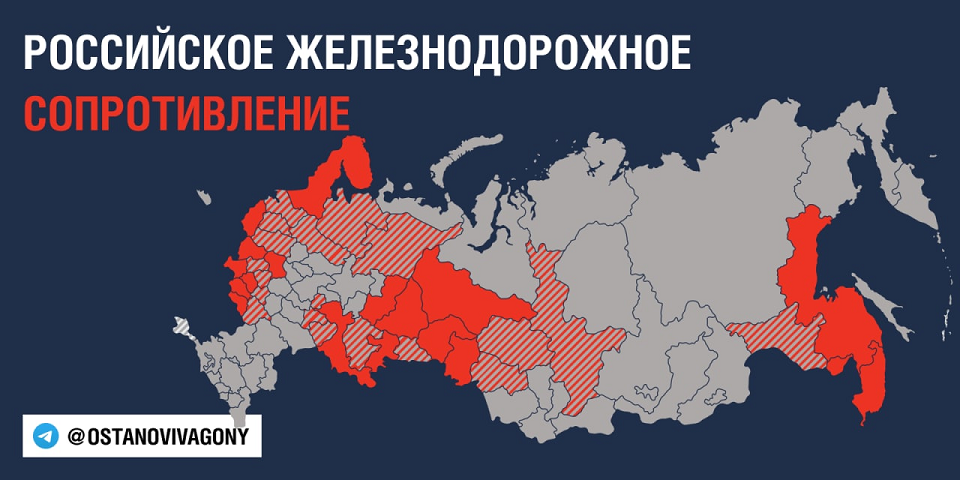 На каналі антивоєнного партизанського руху "Зупини вагони" з'явилася карта залізничного опору, згідно з якою можна виділити чотири виражені осередки опору: у Центральному та Північно-Західному федеральних округах, а також на Уралі та на Далекому Сході.