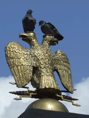 У мережі опублікували символічне фото, зроблене під час параду у Москві 9 травня. Два чорні голуби сіли зверху на фігуру державного герба Російської Федерації - двоголового орла.