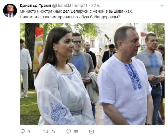"Міністр закордонних справ Білорусі з дружиною у вишиванках. Нагадайте, як там правильно - бульбобандерівці?", "Це картопляна хунта, сама нещадна у світі!", "Картоплі цьому хлопцеві!", - з гумором коментують фото користувачі соціальної мережі Twitter.