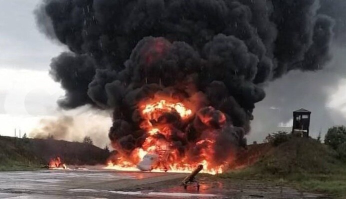 У мережі опублікували кадри потужного вибуху на військовому аеродромі у Сольцях Новгородської області Росії. По фото видно, що спалахнув дальній надзвуковий ракетоносець-бомбардувальник Ту-22М3.