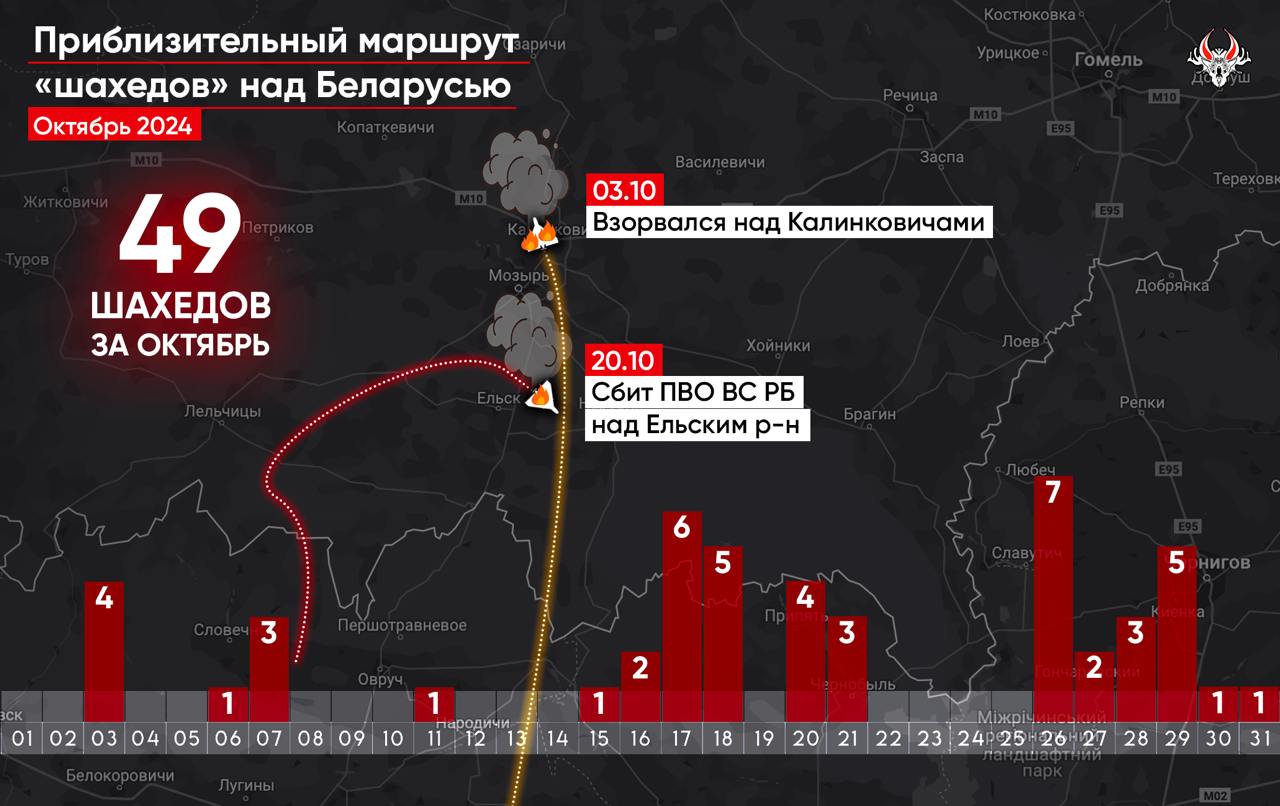 Зокрема, 3 жовтня один із дронів впав та вибухнув у Калинковичі Гомельської області, а 20 жовтня "шахед" збили сили ППО в Єльському районі.
