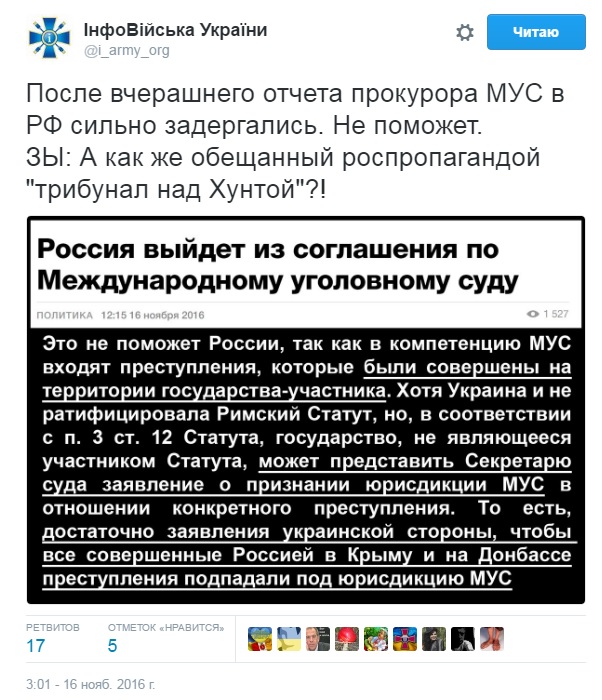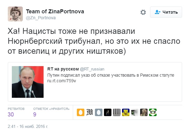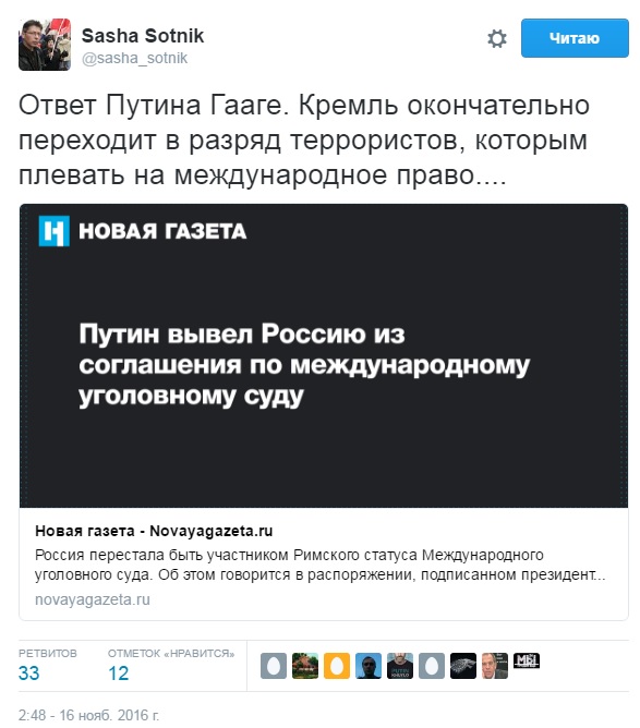 Розпорядження російського президента Володимира Путіна щодо виходу РФ з Римського статуту Міжнародного кримінального суду (МКС) в Гаазі викликало бурхливе обговорення серед українського і російського сегментів соціальних мереж.