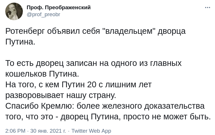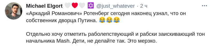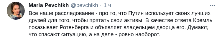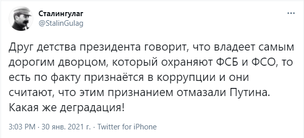 "Друг дитинства президента говорить, що володіє найдорожчим палацом, який охороняють ФСБ і ФСО, тобто за фактом визнається в корупції і вони вважають, що цим визнанням відмазали Путіна. Яка ж деградація!" - обурюється користувач сойсеті під ніком Сталінгулаг.