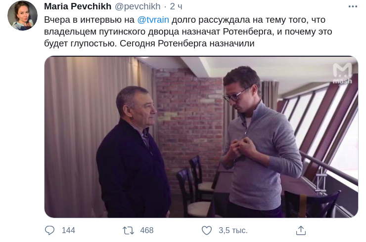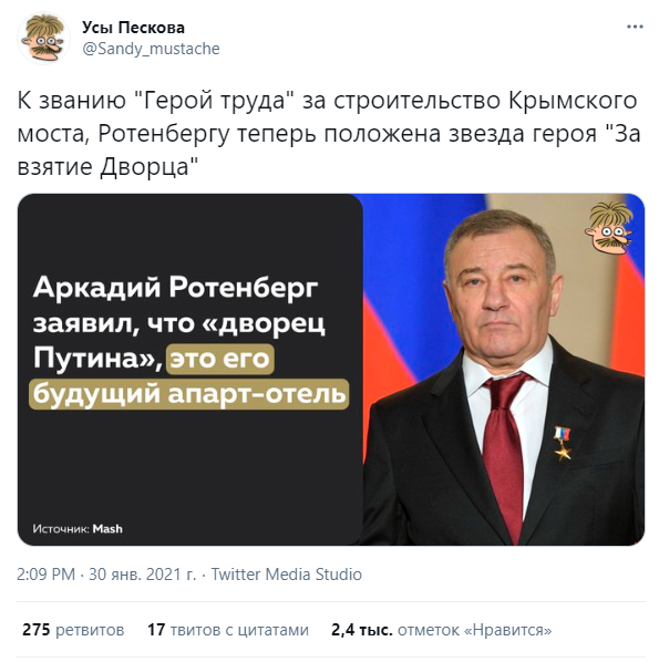 Зізнання колишнього спаринг-патрнера президента Росії Володимира Путіна і Героя Праці РФ, нагородженого за будівництво Кримського моста, бізнесмена Аркадія Ротенберга в тому, що саме він є офіційним власником так званого "палацу Путіна" на узбережжі Чорного моря, викликало бурхливу реакцію в мережі.