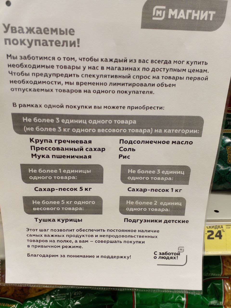 У Росії після введення обмежень на продаж деяких соціально значущих товарів в одні руки в мережах гіпермаркетів "Ашан" і "Атак", ті ж дії здійснила й торгова мережа "Магніт".