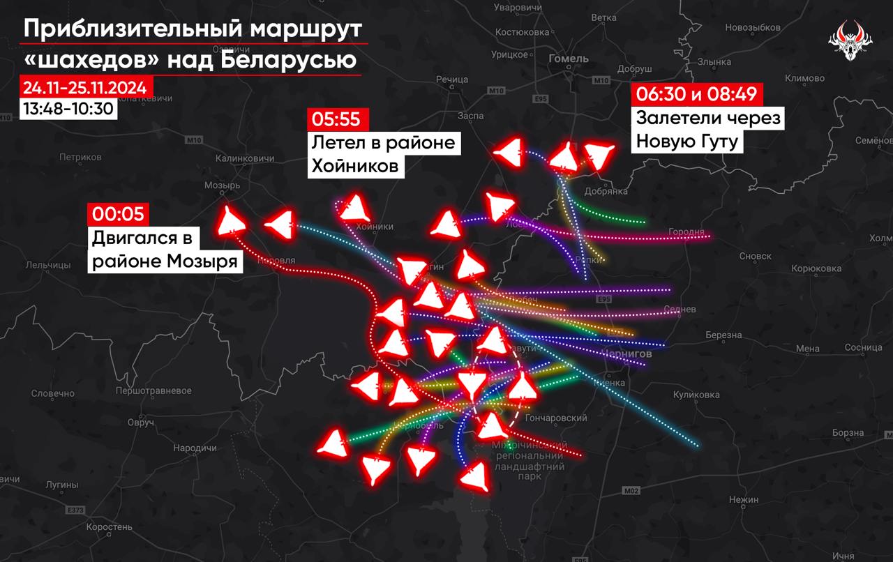Перший захід було зафіксовано о 13:48 24 листопада у районі Комаріна з подальшим виходом на Прип'ять о 14:11. Далі шахеди залітали до Білорусі з 14:04 і до 08:49 25 листопада.