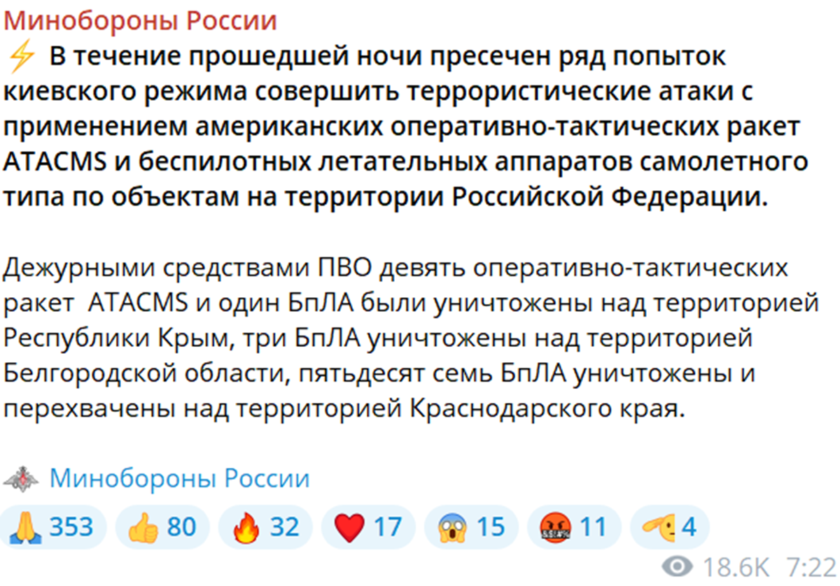 У свою чергу, міноборони РФ стверджує, що вночі 19 травня було сили ППО нібито знищили дев'ять ракет ATACMS і один дрон над Кримом, 3 БпЛА над Бєлгородською областю та 57 безпілотників було перехоплено або знищено над Краснодарським краєм.