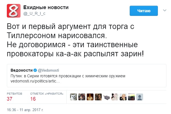 У соцмережах тут же взялися коментувати дану заяву. "Ось і перший аргумент для торгу з Тиллерсоном намалювався. Не домовимося - ці таємничі провокатори яа-а-ак розпиляють зарин!", "І знаєте, хто буде провокатором?! Так-так, він же!", - відзначають користувачі Twitter.