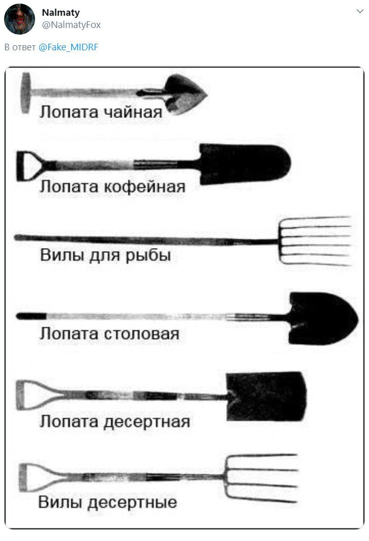Коментатори пропонують також інші варіації столових наборів, в які входять, зокрема, лопати чайні, кавові, десертні і навіть вила для риби.