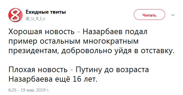 Коментатори почали ділитися враженнями, згадуючи скільки всього сталося за час Назарбаєва при владі. Також в соцмережах стали гадати, хто з "вічних" президентів пострадянських простору піде на спокій наступним.