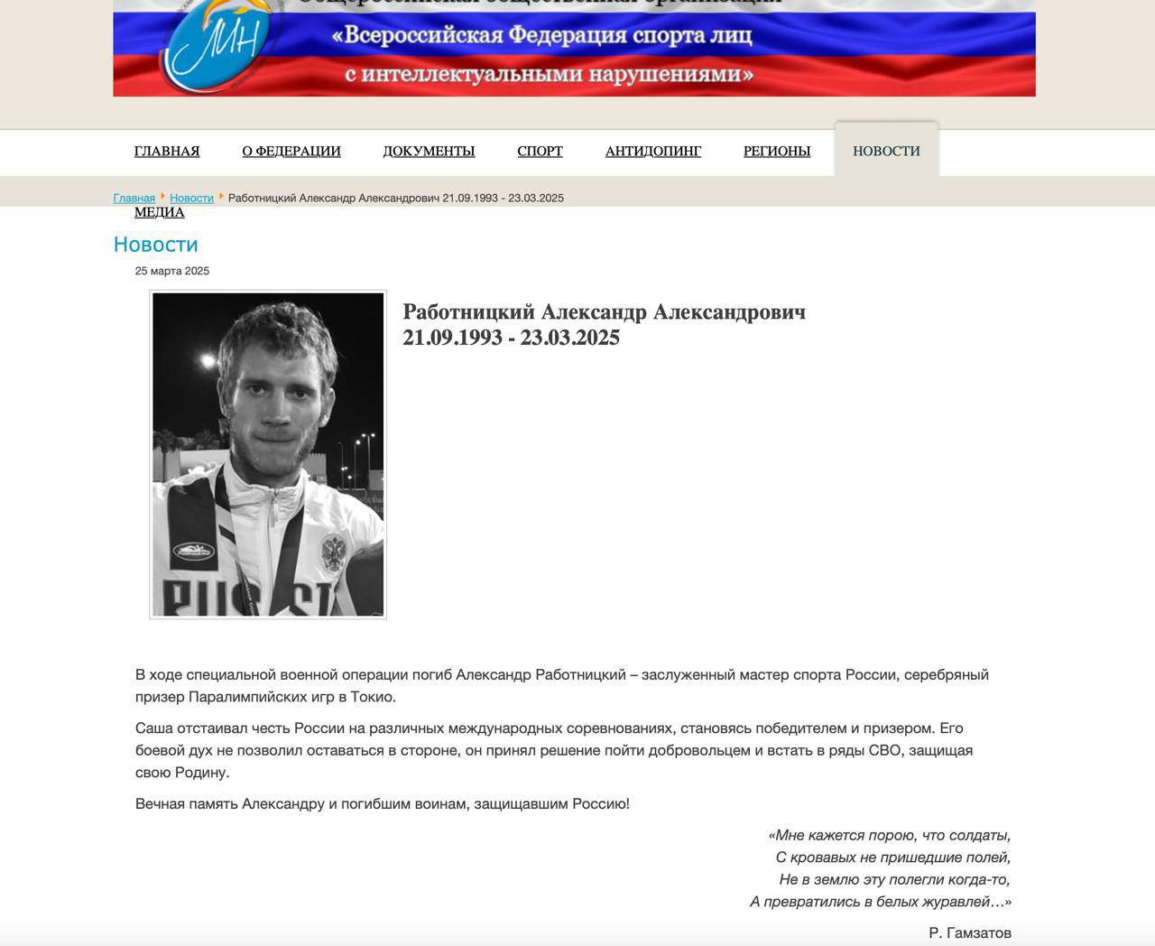 "В Україні загинув російський паралімпієць із розумовою відсталістю Олександр Работницький. Його переконали підписати контракт, незважаючи на інвалідність. Не погребували навіть таким".