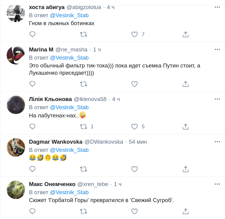 Як зауважив у своєму пості український політолог Олексій Голобуцький, Лукашенко, щоб догодити Путіну і здаватися нижче своїх 1,87 м зросту, змушений був одягнути черевики на дуже тонкій підошві в досить прохолодну навіть для Сочі погоду. У російського президента взуття навпаки була надзвичайно товстим, що дозволило додати до його зросту 2-2,5 см.