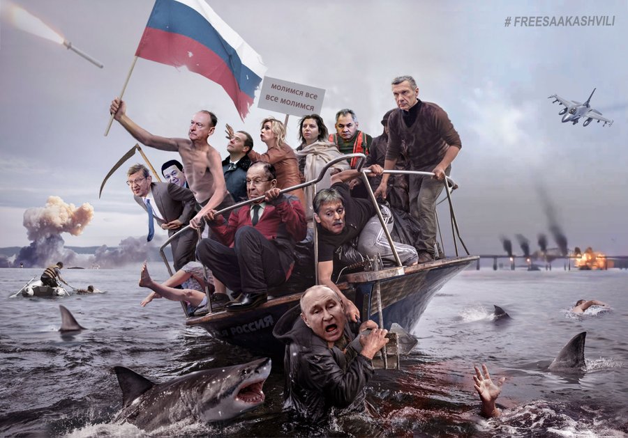 На картині можна помітити, як вся когорта російських пропагандистів, політиків та безпосередньо господар Кремля володимир путін намагаються врятуватись втечею на моторному човні. На тлі можна помітити густий дим від вибухів, ракету в бік вже палаючого Кримського моста та винищувач F-16.