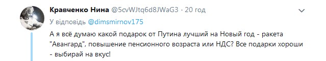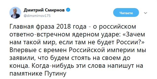 "Головна фраза 2018 року - про російський у відповідь/зустрічний ядерний удар: "Навіщо нам такий світ, якщо там не буде Росії?" Вперше з часів Російської імперії ми заявили, що будемо стояти на своєму до кінця. Коли-небудь ці слова напишуть на пам'ятнику Путіну", - написав Смірнов.