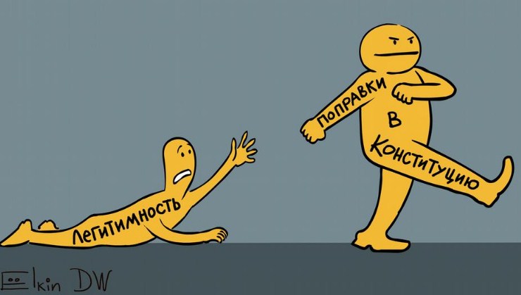 Так, автор висміяв правки до Основного закону Росії за допомогою двох однакових персонажів, один з яких підписаний словом "легітимність", а другий - "правки до Конституції", при цьому правки стрімко і впевненим кроком йдуть від "легітимності".