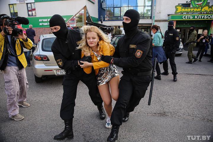 Затримання почалися через дві години після початку маршу, коли його учасниці перебували біля торгового центру "Айсберг" в білоруській столиці. Однією із перших була затримана Ніна Багінська. На опублікованих кадрах видно, як співробітники ОМОНу ведуть жінку, а потім заштовхують її в автозак. При цьому активістка запитує, де її стяг.