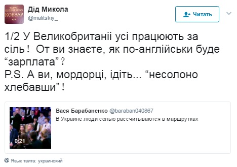 Українські користувачі соціальних мереж бурхливо обговорюють пропагандистську заяву в ефірі російського телебачення про те, що в Україні через відсутність грошей в маршрутках люди розплачуються сіллю.
