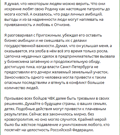 Він пафосно закликав вагнерівців бути тверезими у своїх рішеннях та думати про майбутнє країни, зазначивши, що бунт би мав наслідки, включаючи знищення усіх причетних до нього.