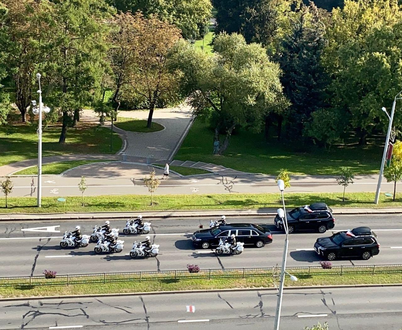 Президентський кортеж спочатку побачили на проспекті Переможців. Потім він потрапив на фото і відео біля самого Палацу незалежності.