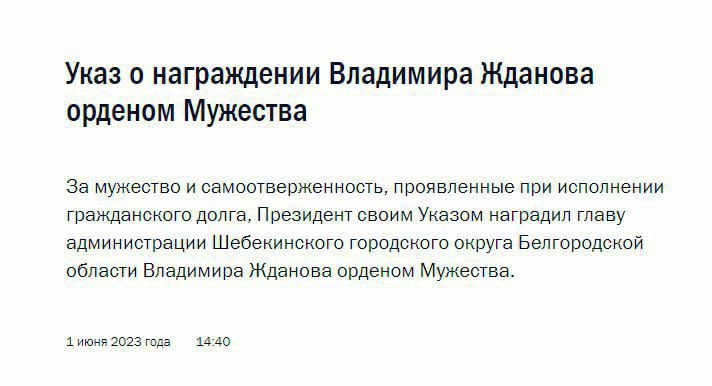 А голову Шебекінського округу Володимира Жданова було нагороджено "орденом Мужності".