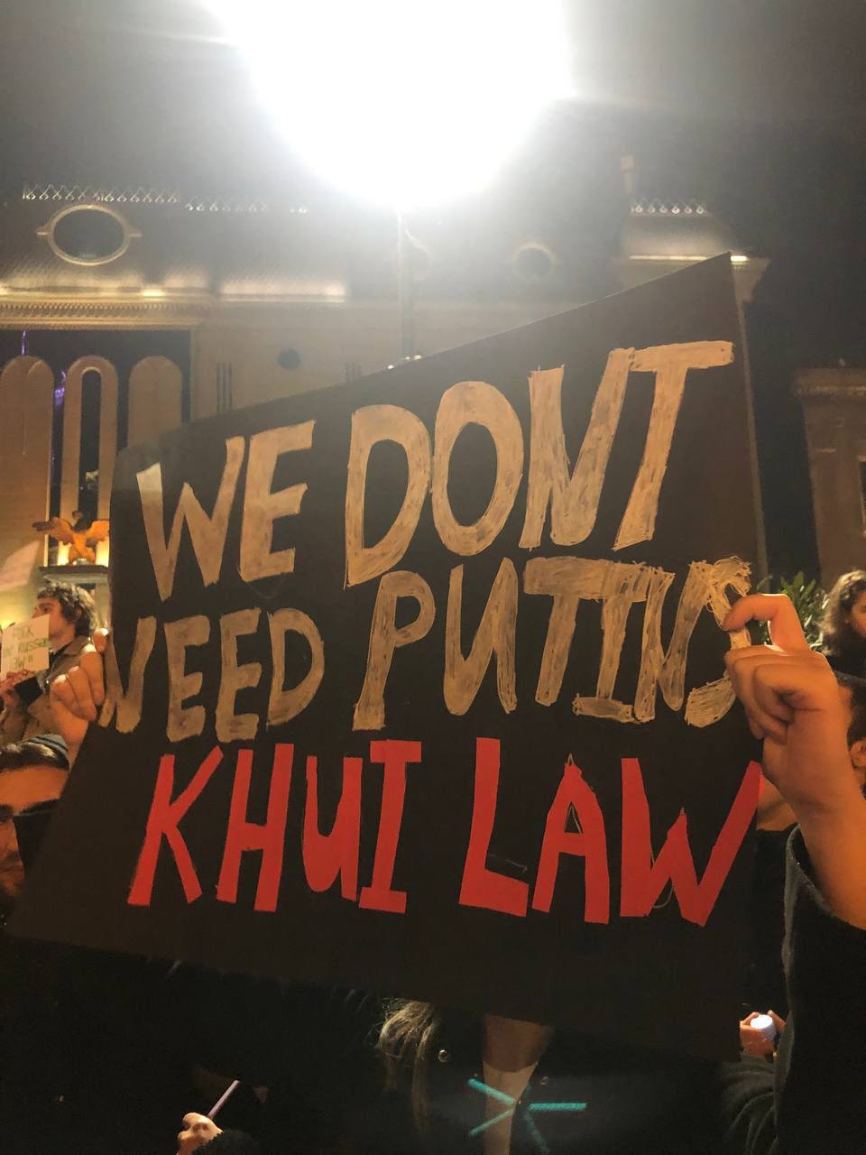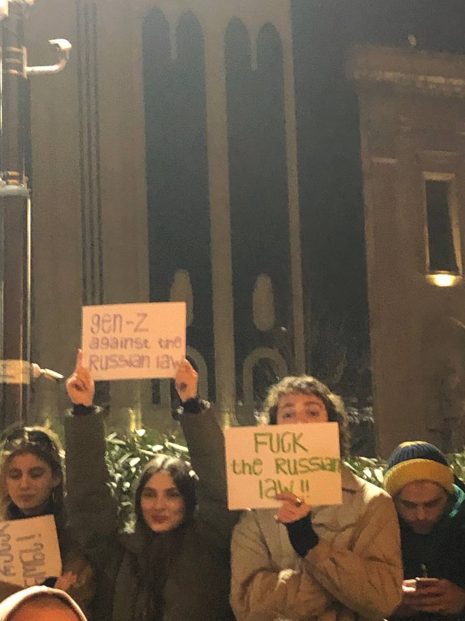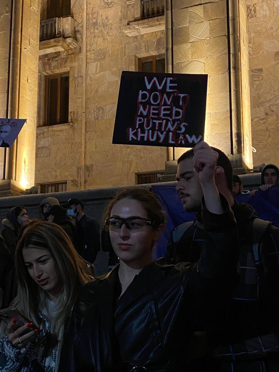 Також люди скандують "Ні російському закону", тримають ватмани з написами "Russian law is not the will of Georgia" ("Російський закон - це не воля Грузії" - "Апостроф") та "F*ck the russian law" ("Н**** російський закон" - "Апостроф"). Відповідні фото з'явилися в мережі.