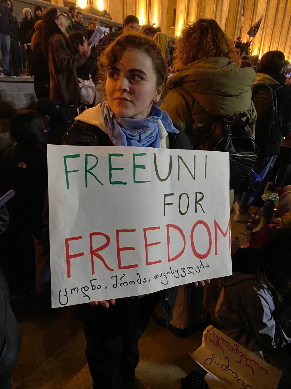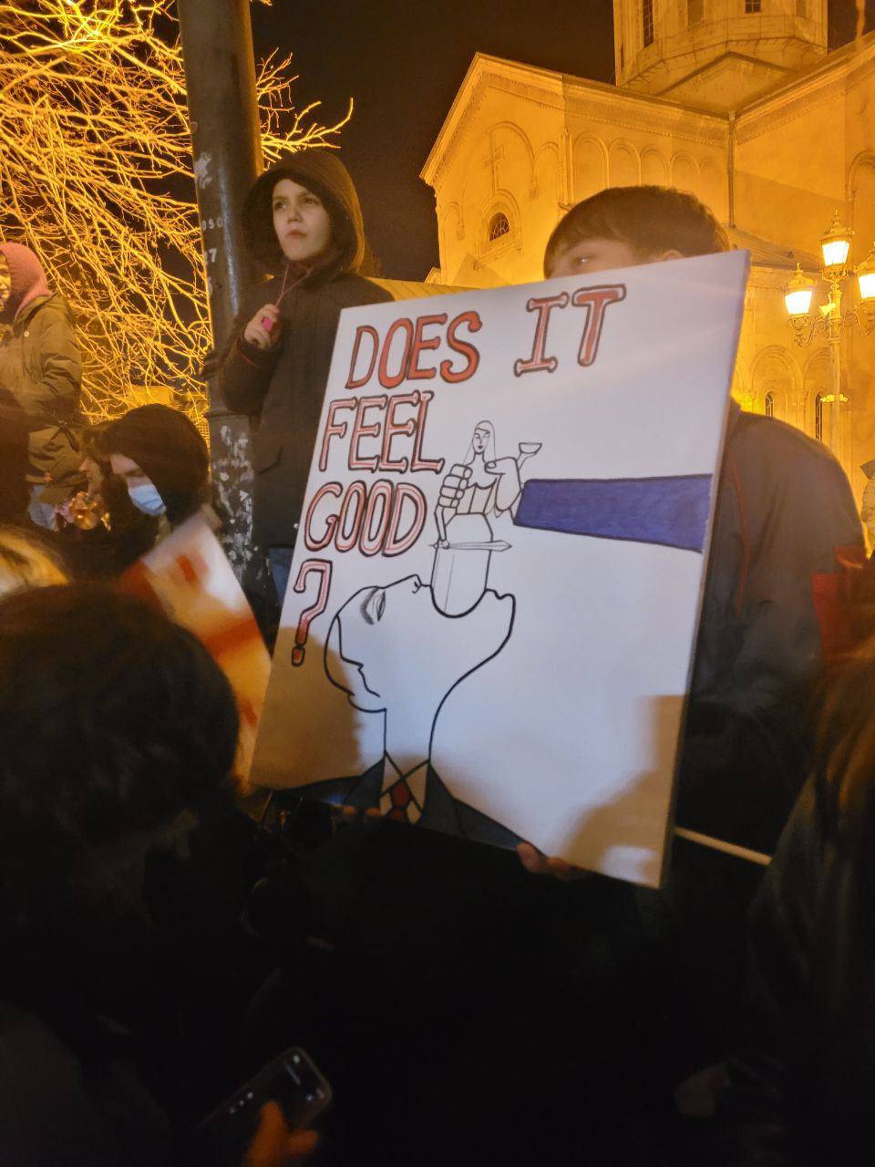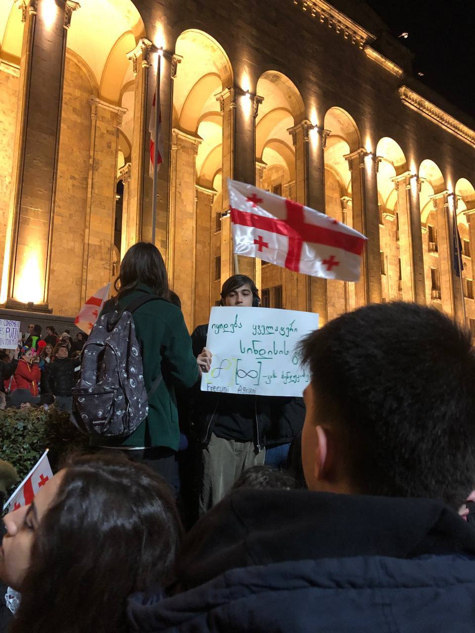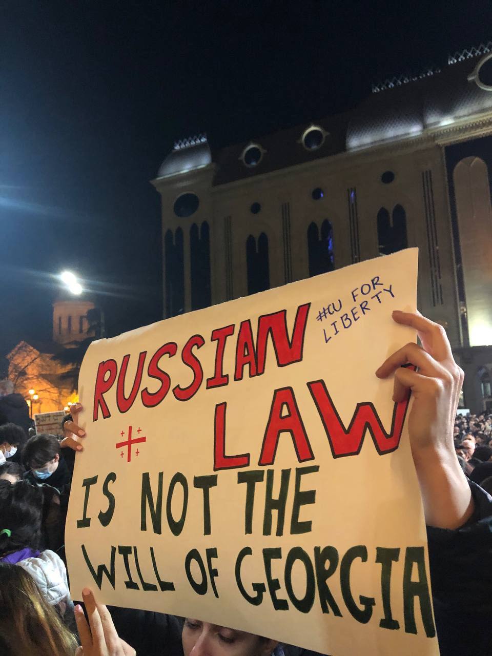 Також люди скандують "Ні російському закону", тримають ватмани з написами "Russian law is not the will of Georgia" ("Російський закон - це не воля Грузії" - "Апостроф") та "F*ck the russian law" ("Н**** російський закон" - "Апостроф"). Відповідні фото з'явилися в мережі.
