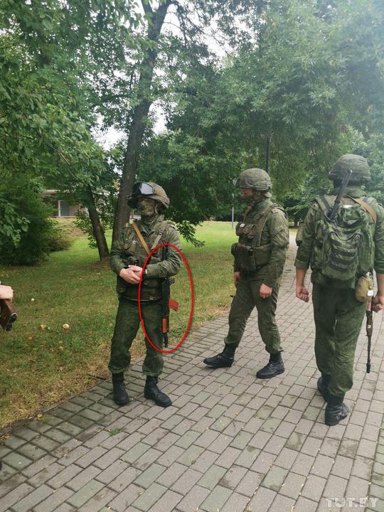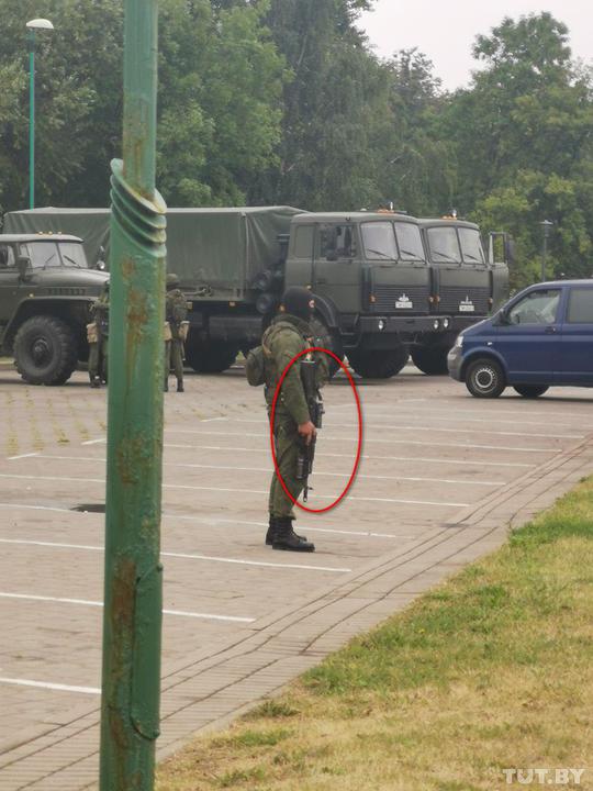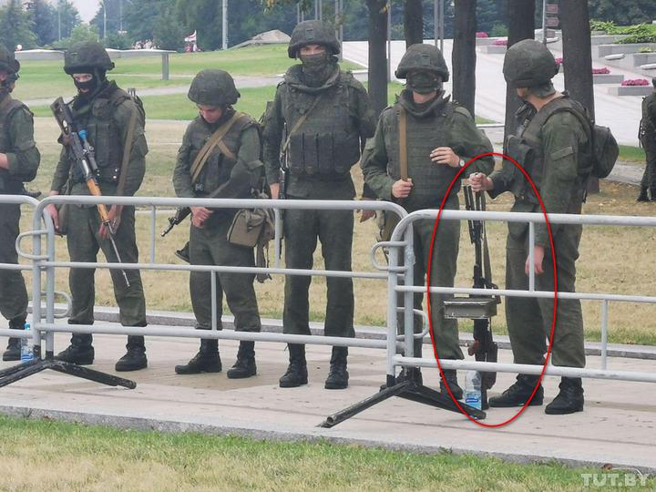 Найпоширенішим автоматом у білоруських військових був АК-74. Це основна автоматична зброя білоруської армії, що залишилася з часів СРСР. Вперше на протестах такий автомат був помічений у конвойного внутрішніх військ на Окрестіна, потім - у десантників 38-ї бригади, які патрулюють Брест.